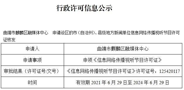 曲靖市麒麟区融媒体中心《信息网络传播视听节目许可证》公示信息