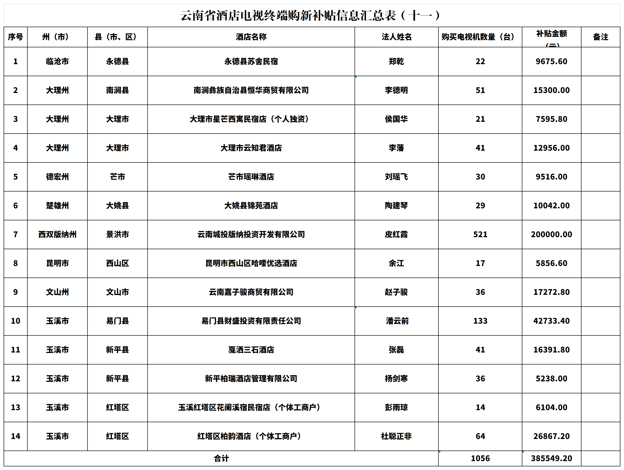 附件:云南省酒店电视终端购新补贴信息汇总表(十一)