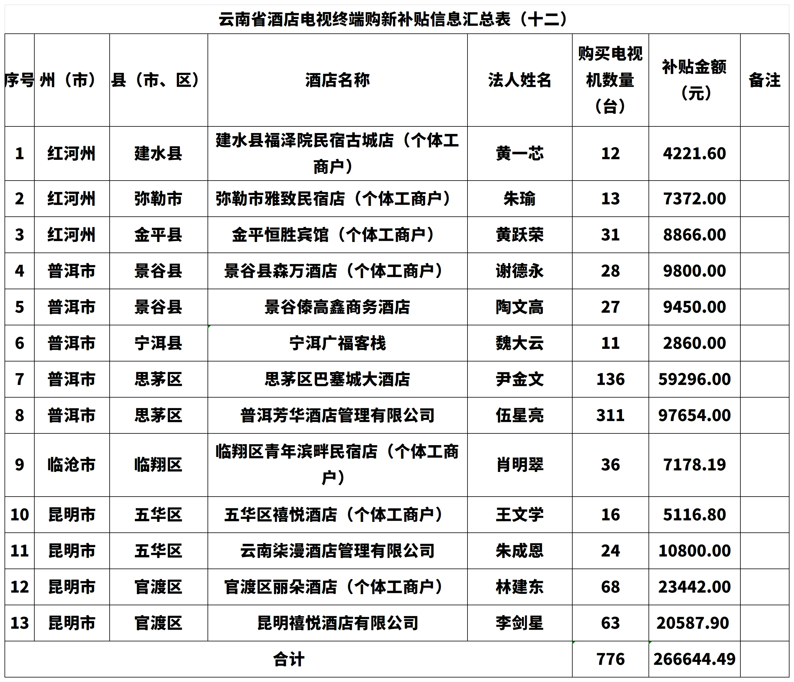 附件:云南省酒店电视终端购新补贴信息汇总表(十二)
