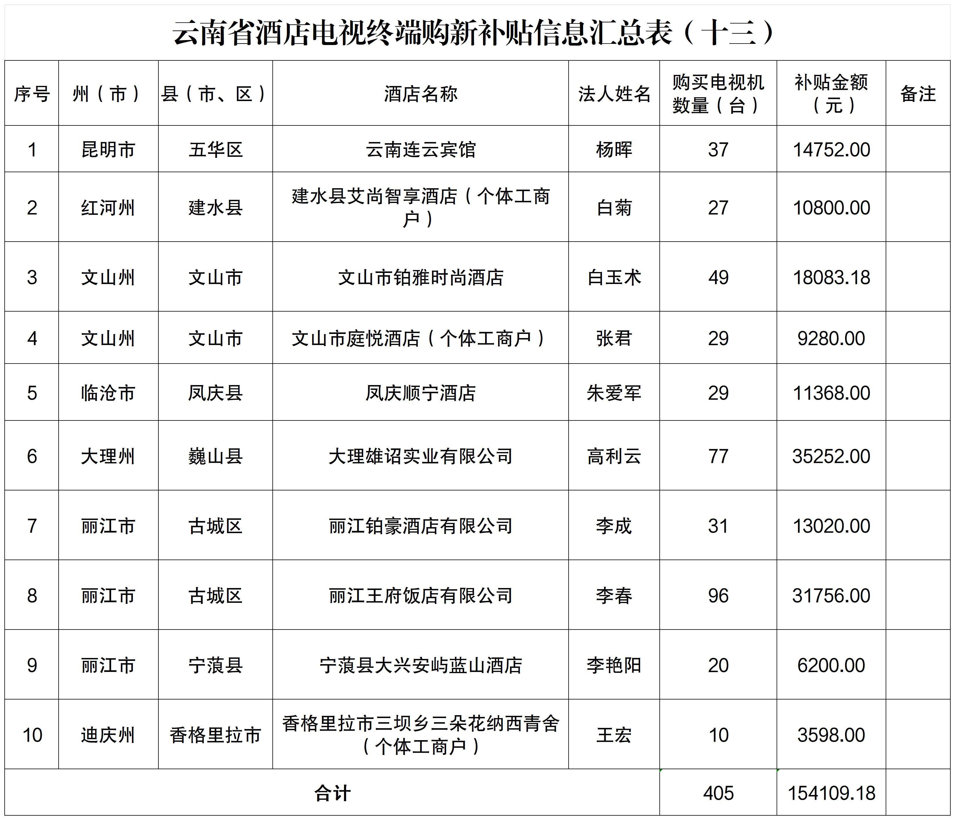 附件:云南省酒店电视终端购新补贴信息汇总表(十三)