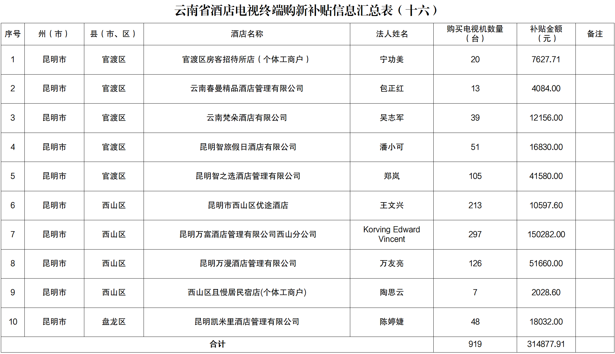 附件:云南省酒店电视终端购新补贴信息汇总表(十六)