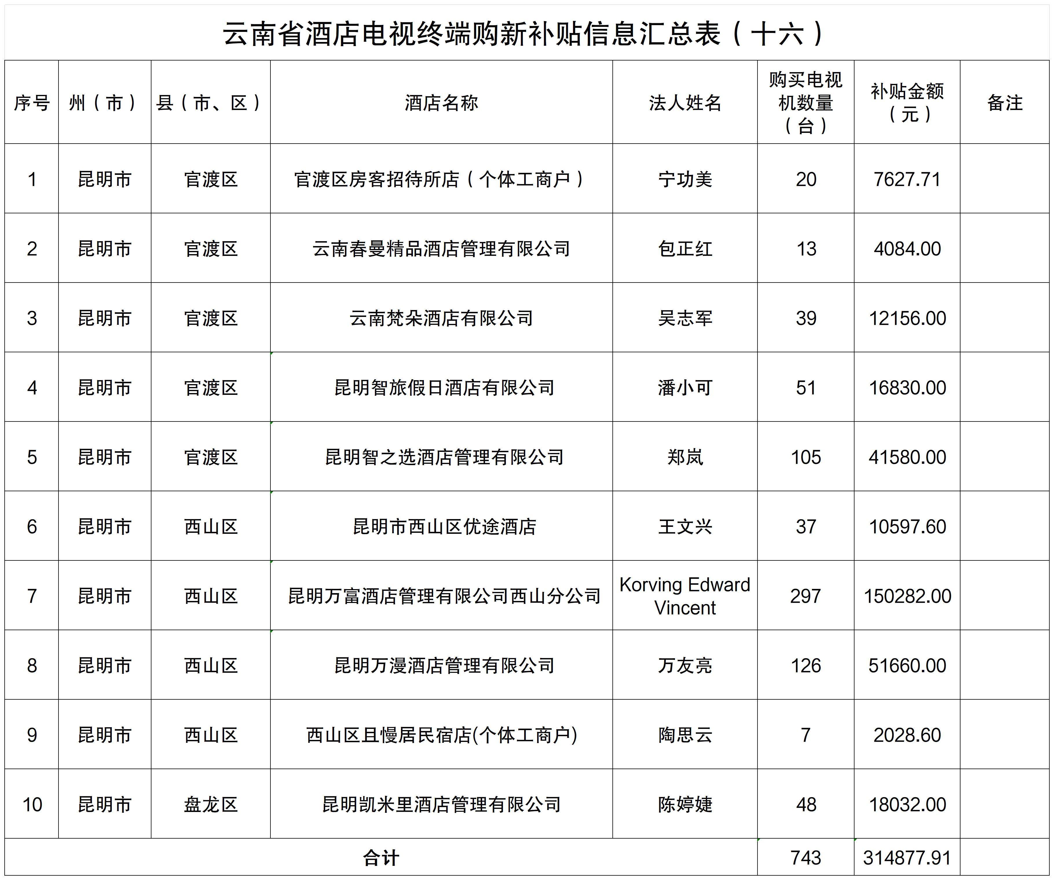 附件:云南省酒店电视终端购新补贴信息汇总表(十六)