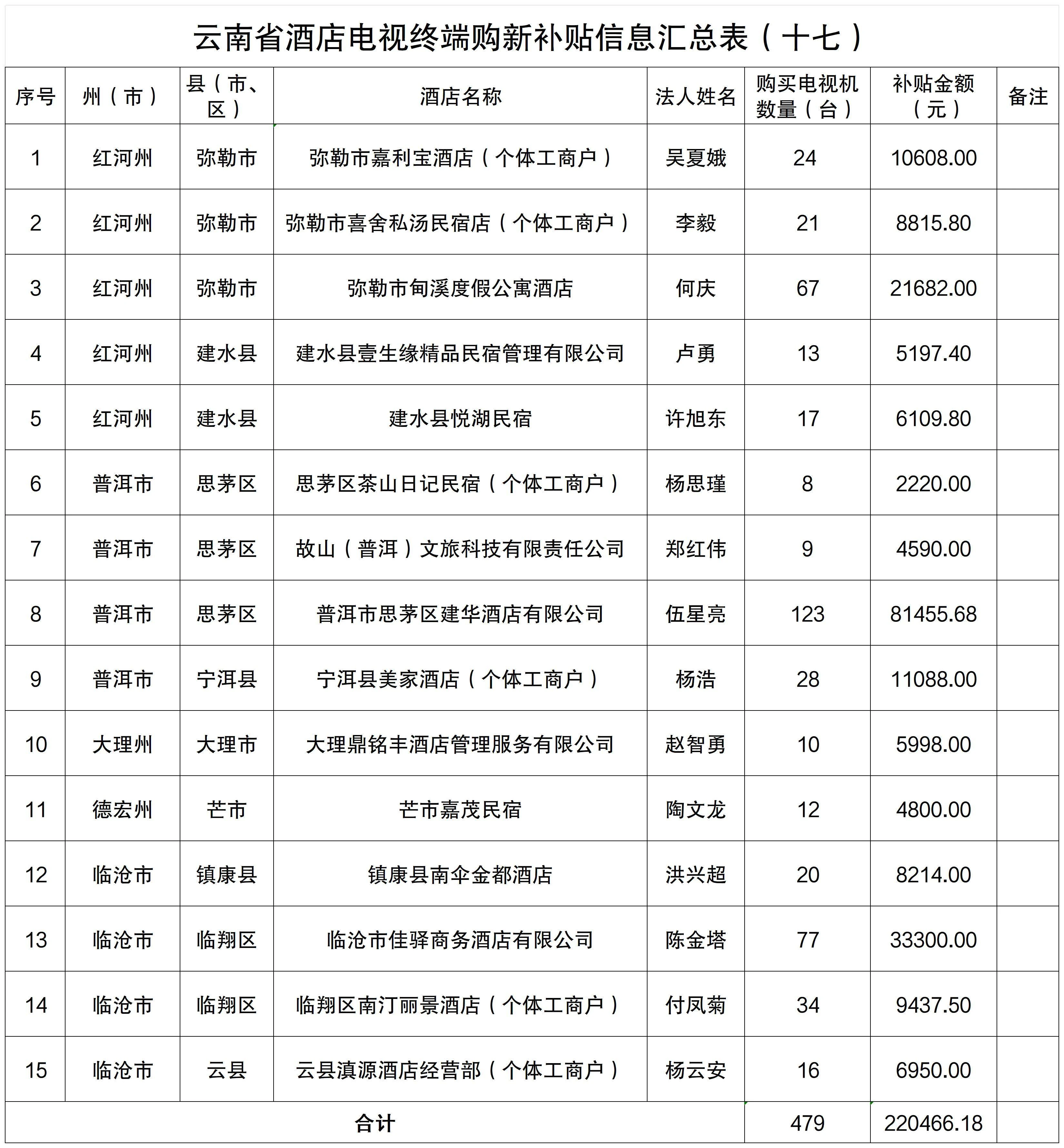 附件:云南省酒店电视终端购新补贴信息汇总表(十七)