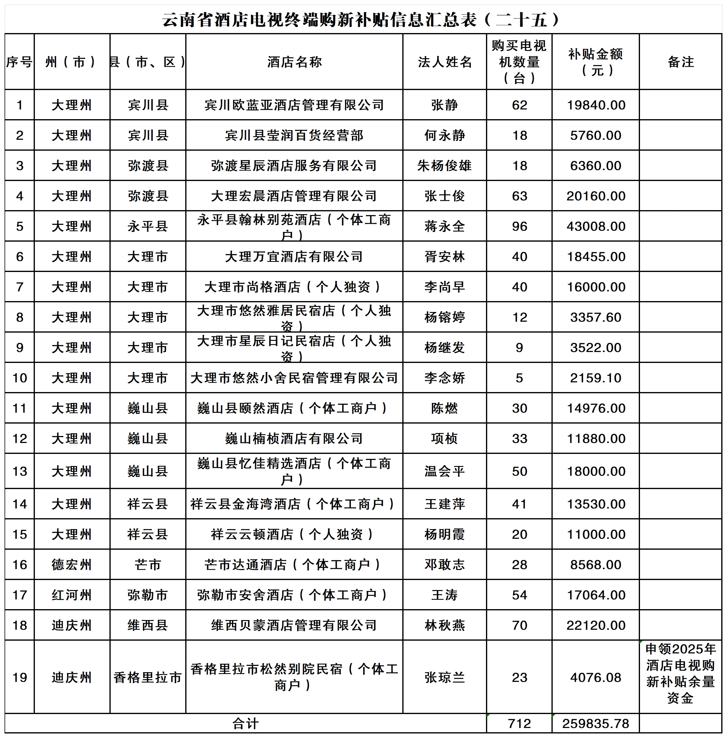 根据《2025年云南省酒店电视终端购新补贴实施细则》明确,经省、州(市)、县(市、区)广电部门审核,大理州宾川欧蓝亚酒店管理有限公司等19家酒店(详见附表)符合补贴条件,现予以公示。