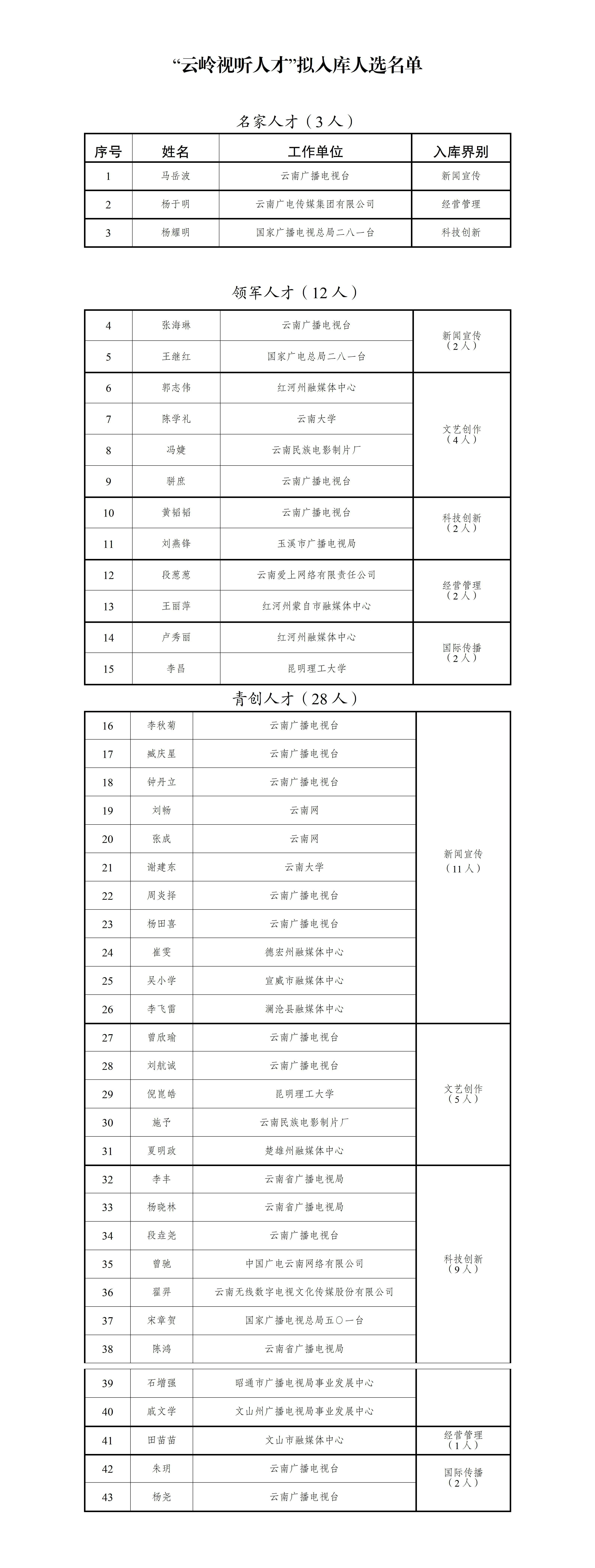 根据《云南省广播电视局关于开展第一届“云岭视听人才”评选工作的通知》(云广发〔2025〕78号)精神,经各地区各有关单位推荐、专业评审、综合评议等程序,省广电局研究产生了“云岭视听人才”直接入库人选和拟入库人选共65名。其中,22名已入选全国广播电视和网络视听行业领军人才、青年创新人才和云南省“兴滇英才支持计划”等上级人才工程的申报人员,直接进入“云岭视听人才库”。43名拟入库人选根据相关规定,现予公示,公示期为2025年12月29日至2026年1月5日。对拟入库人选如有异议,请于公示期内向省广电局机关党委(人事处)、机关纪委反映。