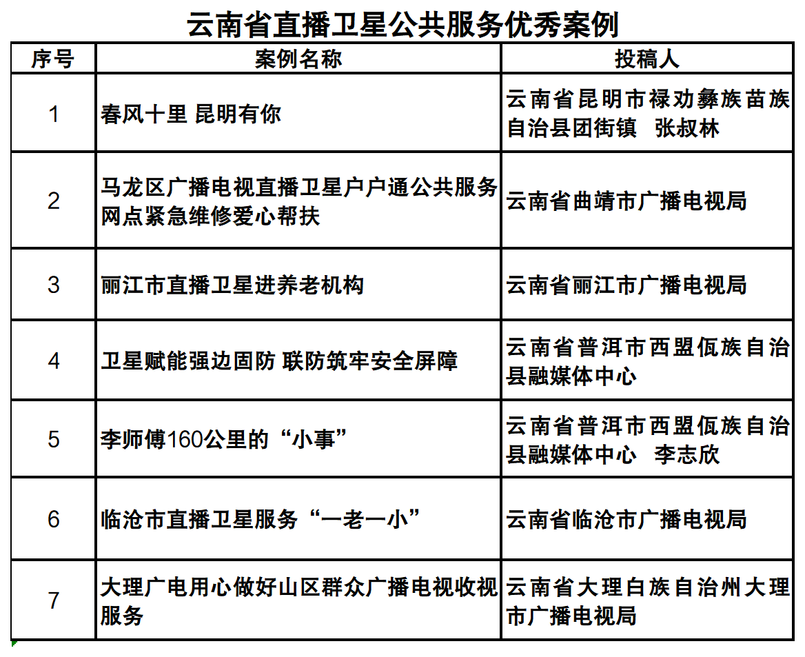 2026年4月23日,第三十二届中国国际广播电视信息网络展览会(CCBN2026)期间,由国家广播电视总局广播电视卫星直播管理中心与广播电视科学研究院联合举办的“直播卫星公共服务优秀案例宣介活动”在北京首钢会展中心举行。对直播卫星公共服务表现突出的优秀组织单位、优秀案例等进行集中宣介,并向优秀代表颁发荣誉证书。云南省广播电视局荣获直播卫星公共服务优秀组织单位,云南选送的7个案例成功入选全国优秀案例。西盟佤族自治县报送的《李师傅160公里的“小事”》案例相关人员应邀到现场作经验交流。