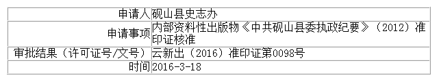 砚山县史志办内部资料性出版物《中共砚山县委执政纪要》(2012)准印证核准