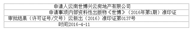 云南世博兴云房地产有限公司申请内部资料性出版物《世博》(2016年第1期)准印证