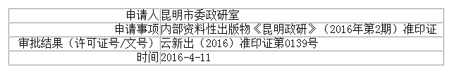 昆明市委政研室申请内部资料性出版物《昆明政研》(2016年第2期)准印证