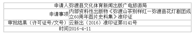 弥渡县文化体育新闻出版广电旅游局申请内部资料性出版物《弥渡山茶别样红—弥渡县花灯剧团成立60周年图片史料集》准印证