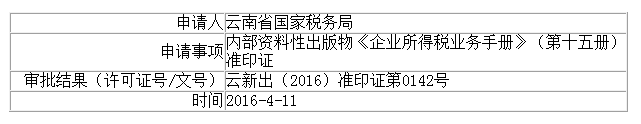 云南省国家税务局申请内部资料性出版物《企业所得税业务手册》(第十五册)准印证