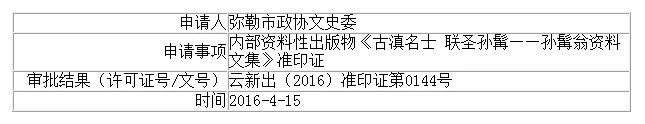 弥勒市政协文史委申请内部资料性出版物《古滇名士 联圣孙髯——孙髯翁资料文集》准印证