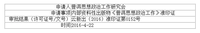 普洱思想政治工作研究会申请内部资料性出版物《普洱思想政治工作》准印证