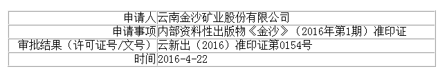 云南金沙矿业股份有限公司申请内部资料性出版物《金沙》(2016年第1期)准印证