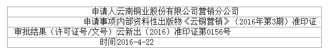 云南铜业股份有限公司营销分公司申请内部资料性出版物《云铜营销》(2016年第3期)准印证