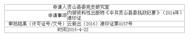贡山县委党史研究室申请内部资料性出版物《中共贡山县委执政纪要》(2014年)准印证