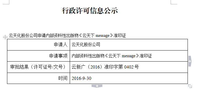 云天化股份公司申请内部资料性出版物《云天下message》准印证