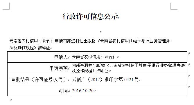 云南省农村信用社联合社申请内部资料性出版物《云南省农村信用社电子银行业务管理办法及操作规程》准印证