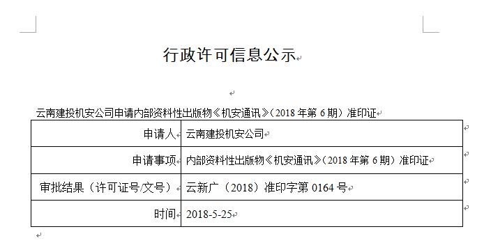 云南建投机安公司申请内部资料性出版物《机安通讯》(2018年第6期)准印证