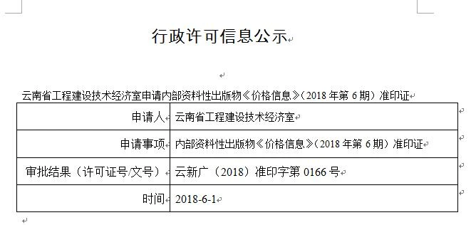 云南省工程建设技术经济室申请内部资料性出版物《价格信息》(2018年第6期)准印证