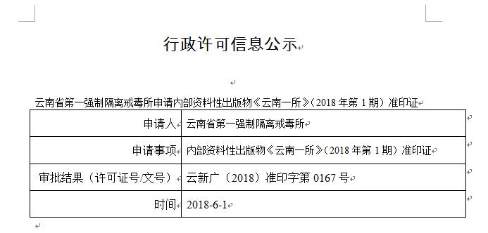云南省第一强制隔离戒毒所申请内部资料性出版物《云南一所》(2018年第1期)准印证