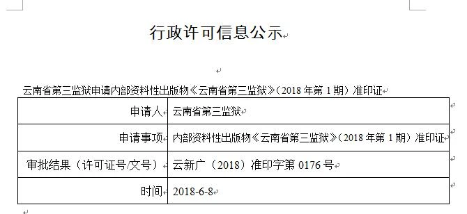 云南省第三监狱申请内部资料性出版物《云南省第三监狱》(2018年第1期)准印证