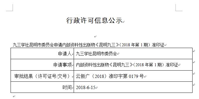 九三学社昆明市委员会申请内部资料性出版物《昆明九三》(2018年第1期)准印证