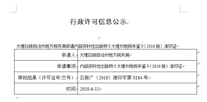 大理白族自治州地方税务局申请内部资料性出版物《大理州地税年鉴》(2016版)准印证